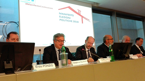 Confapi Aniem, rappresentata dal vicepresidente di Confapi Roma e membro di Giunta Vincenzo Elifani ha partecipato alla presentazione del "Manifesto Costruzioni", un documento sottoscritto dall'intera filiera del settore edile. Nel manifesto si chiedono impegni concreti, a tutte le forze politiche, per rilanciare un comparto che stenta a uscire da una crisi ormai quasi endemica. Le associazioni nazionali firmatarie chiedono che il prossimo Governo metta il comparto edile, da sempre leva di crescita, al centro delle politiche industriali del Paese. Se arriveranno gli interventi e gli strumenti richiesti dal Manifesto - è stato sottolineato durante la conferenza stampa - quello edile può diventare il motore del Paese, facendo crescere il Pil di mezzo punto in più l'anno e recuperando i 600mila posti di lavoro persi nel settore negli ultimi dieci anni.