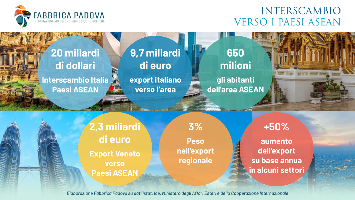 Il Veneto guarda sempre più a Est, ma non solo verso Cina e India. Negli ultimi anni si sta consolidando un asse commerciale dinamico con i Paesi dell’ASEAN – Malaysia, Singapore, Thailandia, Filippine, Vietnam, Brunei, Cambogia, Laos e Myanmar – che si configura come uno dei fronti più promettenti per l’internazionalizzazione delle imprese regionali.