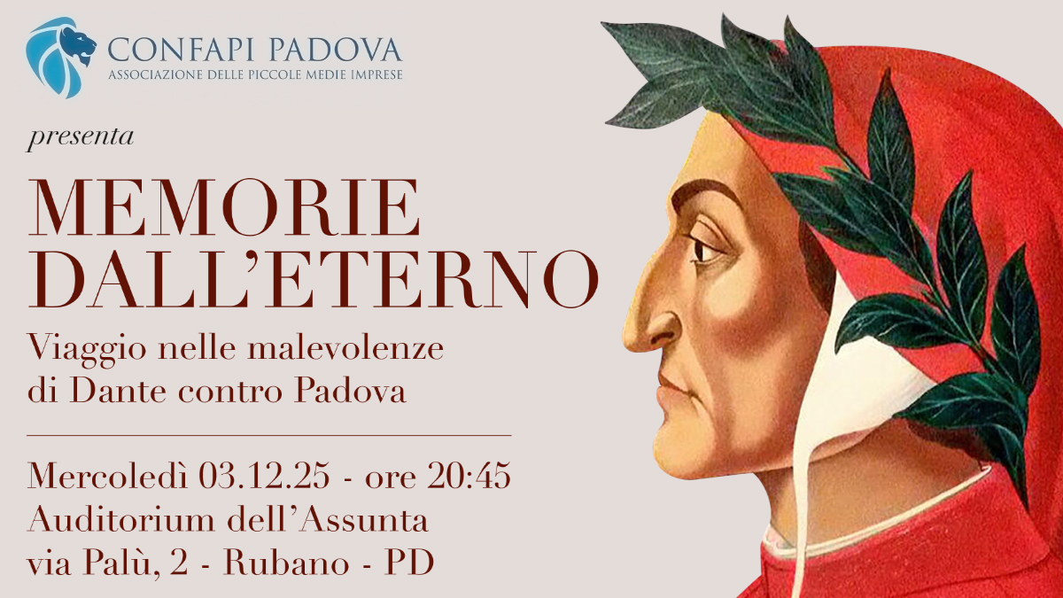 Abbiamo il piacere di invitarvi ad un'iniziativa molto speciale “Memorie dall’eterno – Viaggio nelle malevolenze di Dante contro Padova”, che si terrà mercoledì 3 dicembre 2025 alle ore 20.45 presso l’Auditorium dell’Assunta, in via Palù 2, Rubano.