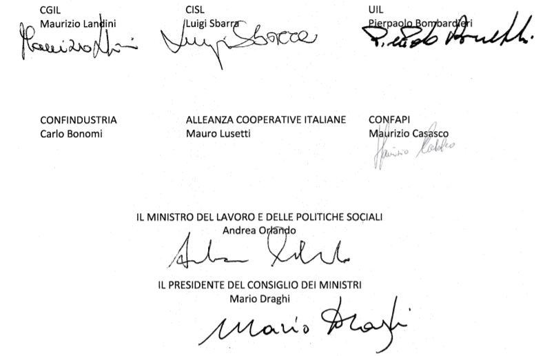 Cassa integrazione per ritardare o evitare i licenziamenti. È il compromesso raggiunto tra governo, imprese e sindacati dopo un lunghissimo pomeriggio di trattative, martedì 29 giugno, a Palazzo Chigi. La proroga del blocco dei licenziamenti rimane circoscritta alla filiera del tessile, non passa la linea dell'allargamento della proroga fino al 31 ottobre ad altri settori in crisi, dalle costruzioni alla manifattura, all'automotive. Ma le imprese si impegnano a ricorrere agli ammortizzatori ordinari prima di interrompere il rapporto di lavoro. Una proroga di fatto del blocco dei licenziamenti, quella ottenuta da Cgil, Cisl e Uil. Il documento congiunto messo a punto a Palazzo Chigi è stato firmato dal premier Mario Draghi, dal ministro del Lavoro, Andrea Orlando, dai leader di Cgil Cisl e Uil e dai presidenti di quattro organizzazioni imprenditoriali: il primo è stato Maurizio Casasco, di Confapi, e poi sono arrivate le adesioni di Confcooperative, Cna e Confindustria.