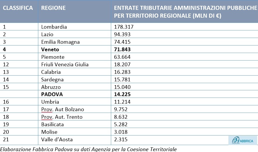 Fabbrica Padova, centro studi di Confapi, stima in 14,2 miliardi il totale delle entrate tributarie corrisposte dai cittadini della provincia all’anno: più di molte regioni italiane. Di questi, quasi 12 miliardi sono assorbiti dalle casse dello Stato. Il direttore Davide D’Onofrio: «La campagna elettorale è appena cominciata e già è iniziata la corsa a chi le spara più grosse. Abbiamo voluto ricordare ai candidati che stanno facendo promesse basate anche sui nostri soldi, che non sono pochi: tra le priorità devono esserci misure che favoriscano la competitività delle imprese».