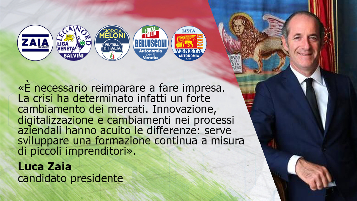 In vista delle elezioni regionali del 20 e 21 settembre Confapi Padova ha interpellato i principali candidati, chiedendo loro di rispondere ad alcune domande, fondamentali per la ripresa del territorio. Ecco l’intervista al presidente in carica Luca Zaia (Lega, Zaia Presidente e Veneta Autonomia più quelle degli alleati Fratelli d'Italia e Forza Italia).