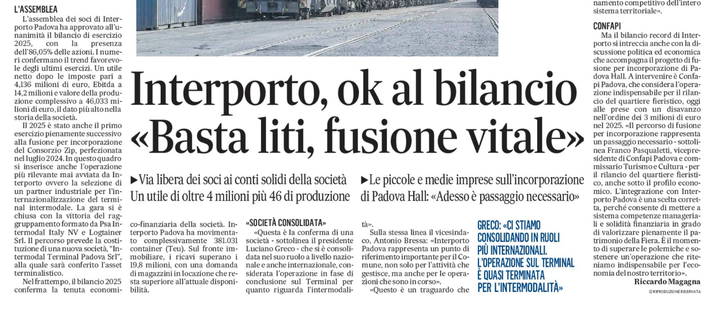 INTERPORTO, OK AL BILANCIO: "BASTA LITI, FUSIONE VITALE" - IL GAZZETTINO DI PADOVA, 31 MARZO 2026