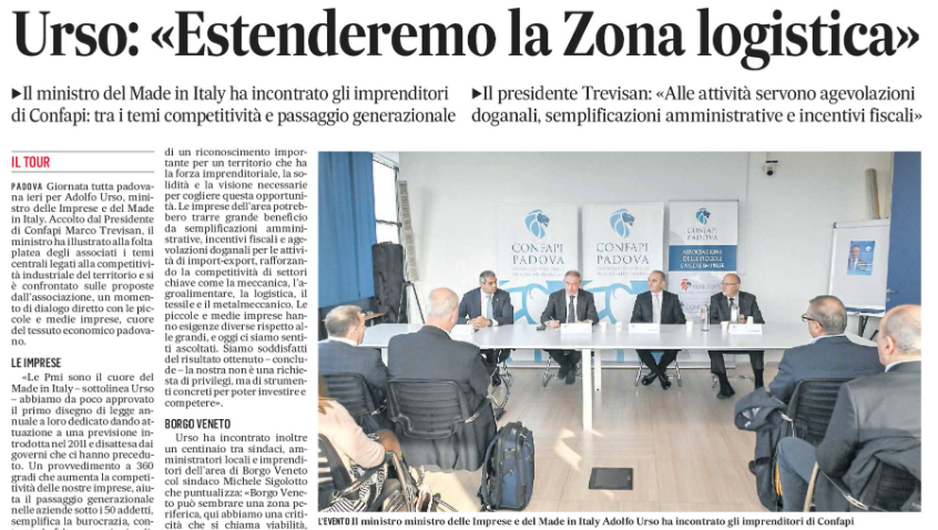 Il Ministro delle Imprese e del Made in Italy Adolfo Urso ha raccolto la sfida lanciata dalle piccole e medie industrie padovane: il governo è al lavoro per estendere la Zona Logistica Semplificata alla provincia di Padova. Accompagnato dal Vice Presidente del Consiglio Regionale Enoch Soranzo, il ministro ha incontrato il presidente di Confapi Padova Marco Trevisan e le aziende associate.