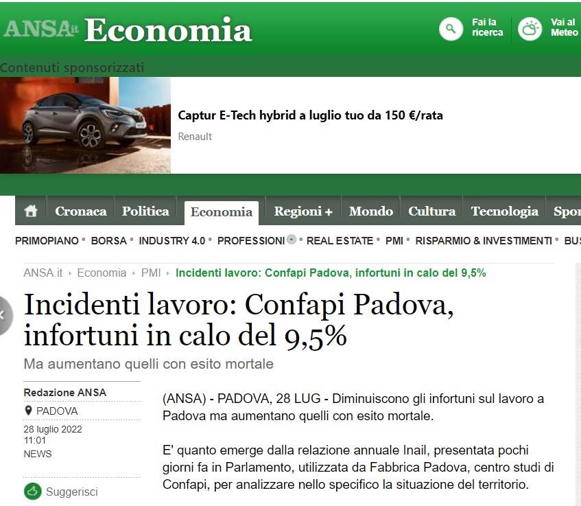 INCIDENTI LAVORO: CONFAPI PADOVA, INFORTUNI IN CALO DEL 9,5% - ANSA, 28 LUGLIO 2022