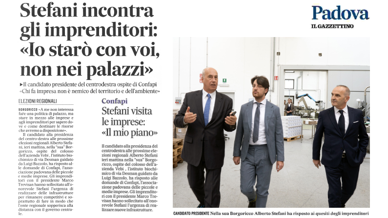 Il candidato alla presidenza del centro-destra alle prossime elezioni regionali Alberto Stefani, nella "sua" Borgoricco, ospite del colosso Vebi , l'istituto biochimico di via Desman guidato da Luigi Bazzolo, ha risposto alle domande di Confapi, l'associazione padovana delle piccole e medie imprese.