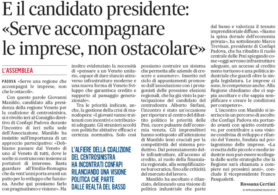 "SERVE ACCOMPAGNARE LE IMPRESE, NON OSTACOLARLE" - IL GAZZETTINO DI PADOVA, 21 NOVEMBRE 2025