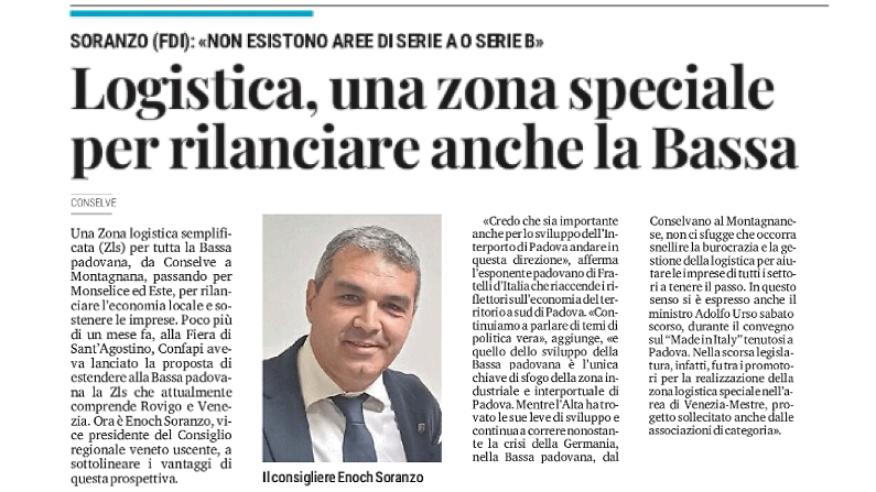 Una Zona logistica semplificata (Zls) per tutta la Bassa padovana, da Conselve a Montagnana, passando per Monselice ed Este, per rilanciare l'economia locale e sostenere le imprese. Poco più di un mese fa, alla Fiera di Sant'Agostino, Confapi aveva lanciato la proposta di estendere alla Bassa padovana la Zls che attualmente comprende Rovigo e Venezia. Ora è Enoch Soranzo, vice presidente del Consiglio regionale veneto uscente, a sottolineare i vantaggi di questa prospettiva.